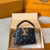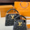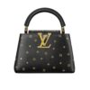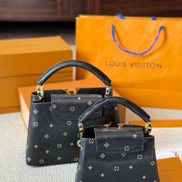 The Capucines Mini bag exudes romance with hand-painted enameled floral details. The design celebrates the house’s craftsmanship leather and a gold-tone LV logo. It protects everyday essentials while allowing for more room inside and can be worn in a variety of ways.