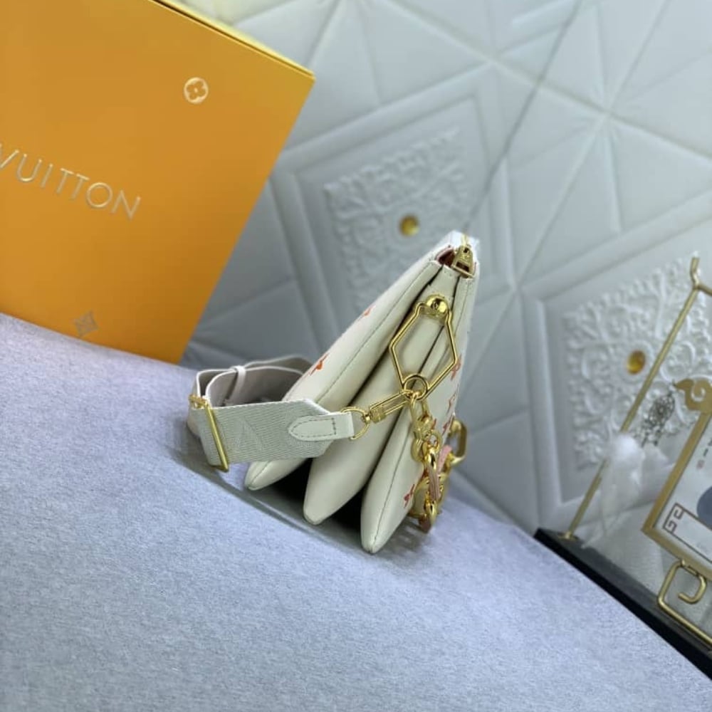 This Coussin PM handbag is made from Monogram Empreinte leather, with a Monogram print that seems to have been painted on the leather in watercolor. The touches of orange, pink and fuchsia bring an optimistic feel to the bag. Thereâs a removable chain with colorful plexiglass links and a removable strap for shoulder or cross-body carry.