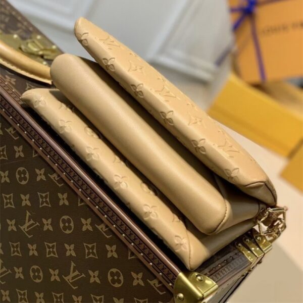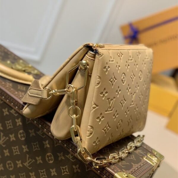 Fashioned from accessorized with a chunky gold-color chain, this Coussin PM handbag is part of the Prefall 2021 collection. Its bright, vibrant colorway is Nicolas Ghesquière’s translation of a bold, joyful feminine attitude. The Coussin can be worn cross-body with the strap, on the shoulder by its short chain, or tucked under the arm.