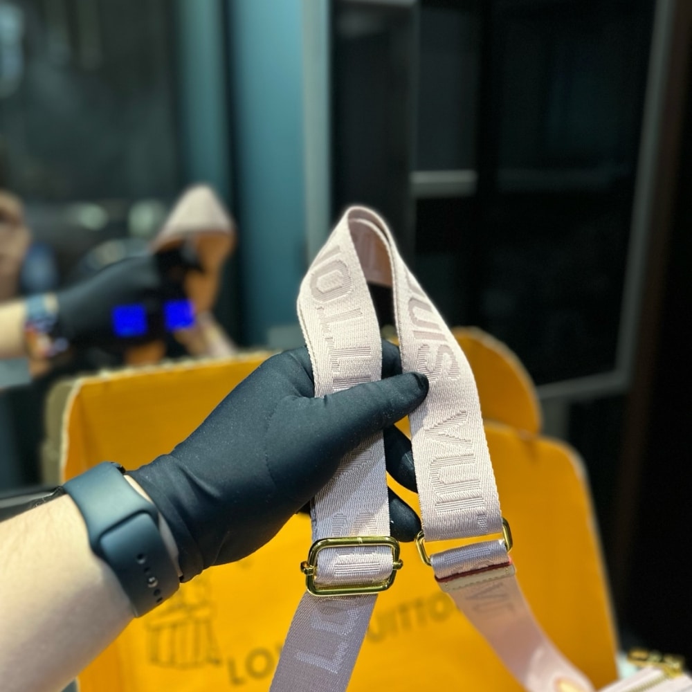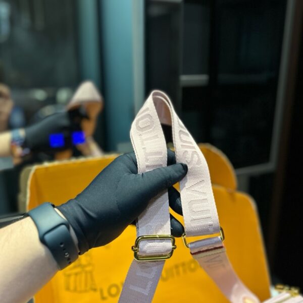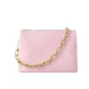 A statement addition to the Coussin line, this PM model showcases the revival of the House’s 2005 Monogram Denim pattern. It is crafted from organic cotton, which is artfully woven on a white base to create a luminous pink finish. The signature chunky LV chain is removable, offering multiple carry options.
