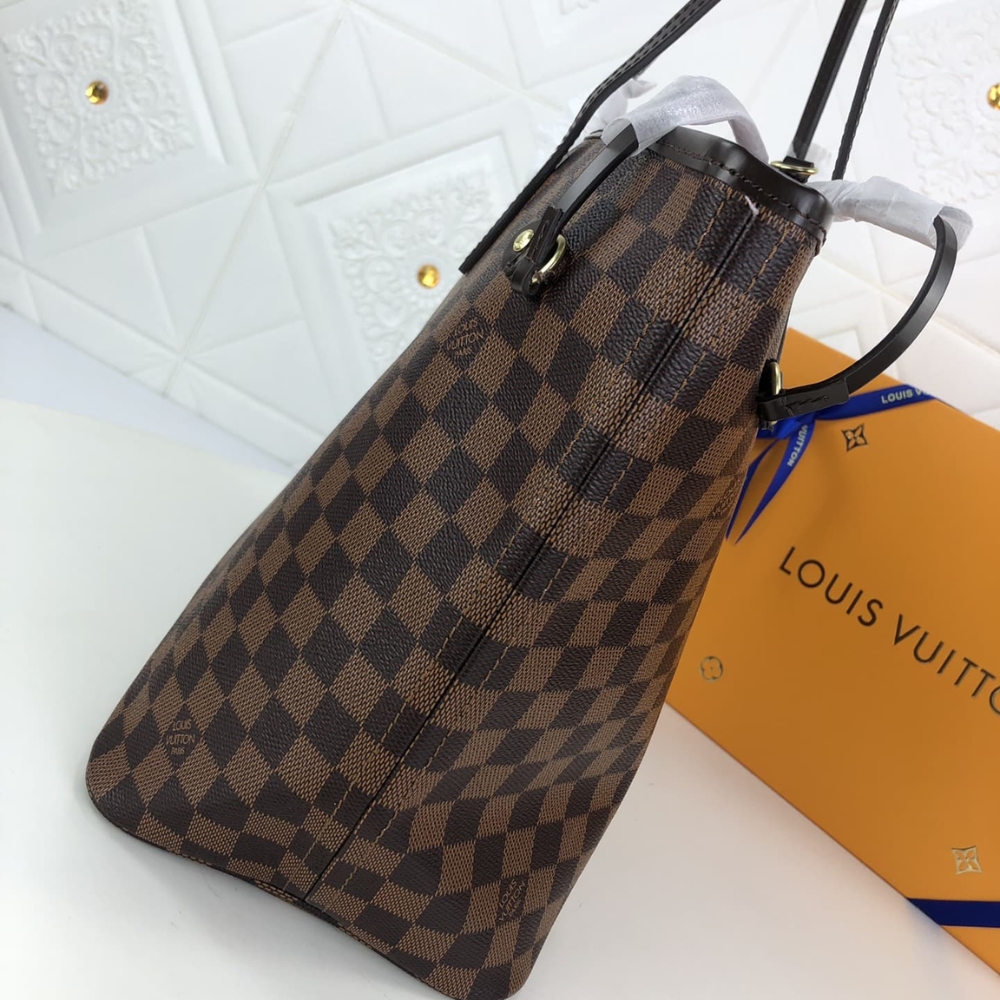 Blending elegance and heritage, the Neverfull MM is crafted from Damier Ebene Canvas, with detailing and a striking textile lining. It has a large capacity and side straps for customisation. The slim handles provide a comfortable fit, while the detachable bag can be used as a clutch or side compartment.