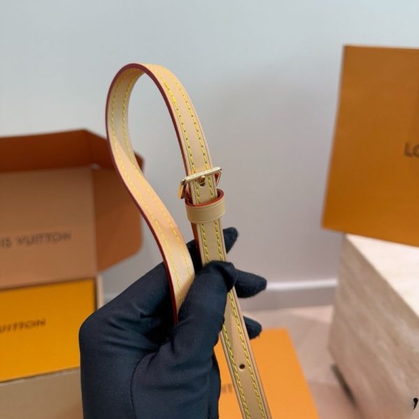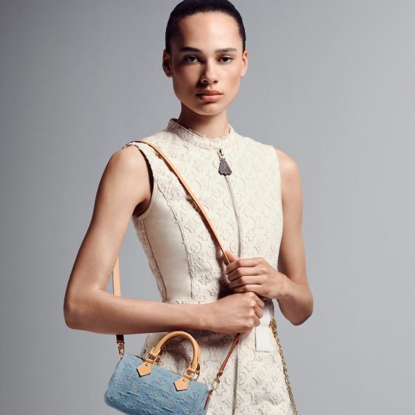 This summery iteration of the Nano Speedy bag comes in pure cotton denim, which is first woven with the Monogram pattern, then bleached and stonewashed to create a fashionable vintage look. The denim is complemented by natural leather with a subtly aged appearance on the bag’s two handles and removable, adjustable shoulder strap.