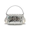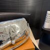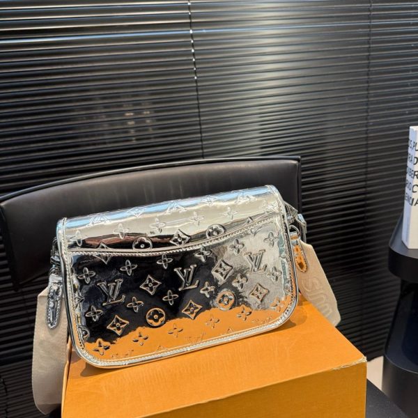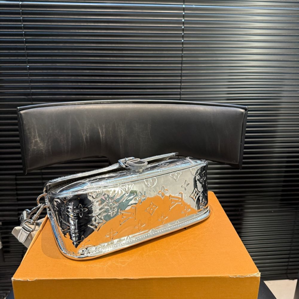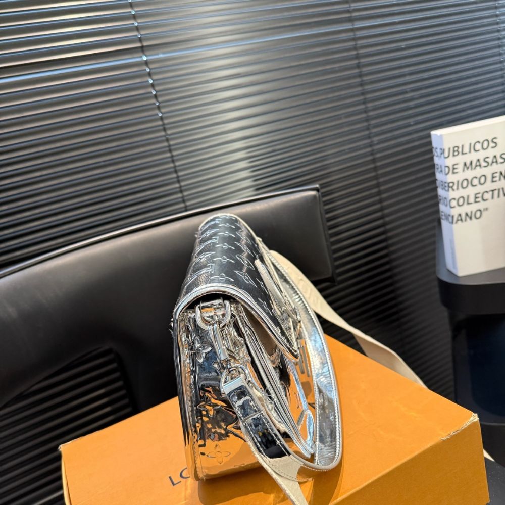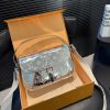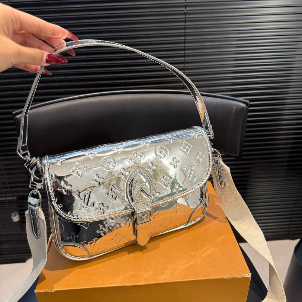 The Louis Vuitton Diane in Silver is a modern interpretation of a classic 90s silhouette, crafted from shimmering metallic Monogram Empreinte leather. It features a structured design with a secure magnetic buckle closure and polished silver-tone hardware that complements the radiant embossed motif. This versatile bag comes with two detachable straps: a short leather handle for elegant shoulder carry and a wide, sporty textile strap for crossbody wear. With its soft microfiber lining and spacious interior, it serves as a bold statement piece that blends heritage style with contemporary functionality.
