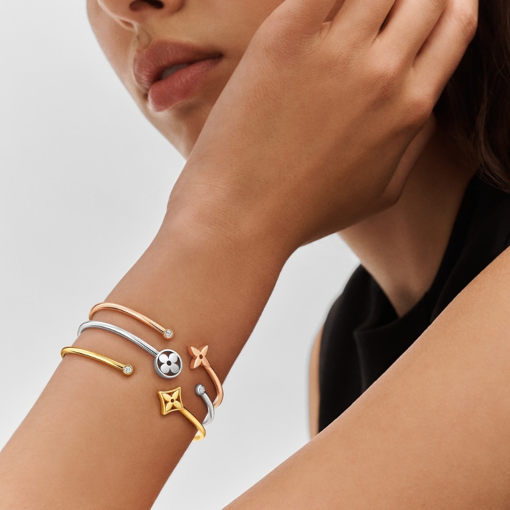 The Louis Vuitton Idylle Blossom Twist Bracelet celebrates the Maisonâs iconic motifs with a refined interplay of fluid lines and timeless elegance. A luminous symbol of prestige and sophistication, it enhances every gesture with an aura of modern luxury and effortless style.