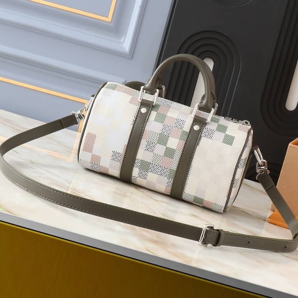 This Keepall Bandoulière 25 city bag is fashioned from beige Damoflage canvas, with its pixelated treatment of the Damier checkerboard. Trimmed with khaki-color leather trim, it features an exquisitely crafted LV charm. Versatile, the bag has two rolled leather top handles for hand carry and a removable and adjustable strap for shoulder or cross-body wear.