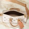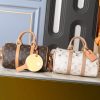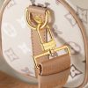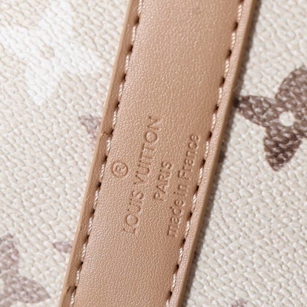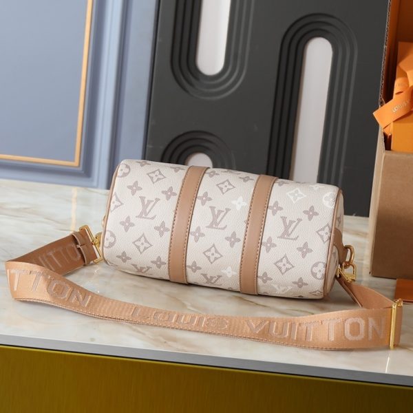 The Louis Vuitton Keepall Bandoulière 25 in Monogram Beige is a compact interpretation of the Maison’s iconic travel bag, crafted from durable Monogram coated canvas in a sophisticated neutral palette. This miniature duffle features smooth leather trim, including rolled top handles and a secure double-zip closure accented by polished gold-tone hardware. Designed for versatile daily use, it comes with a detachable and adjustable wide textile strap, allowing for comfortable shoulder or crossbody carry. This stylish accessory perfectly blends heritage travel aesthetics with modern, small-scale functionality.