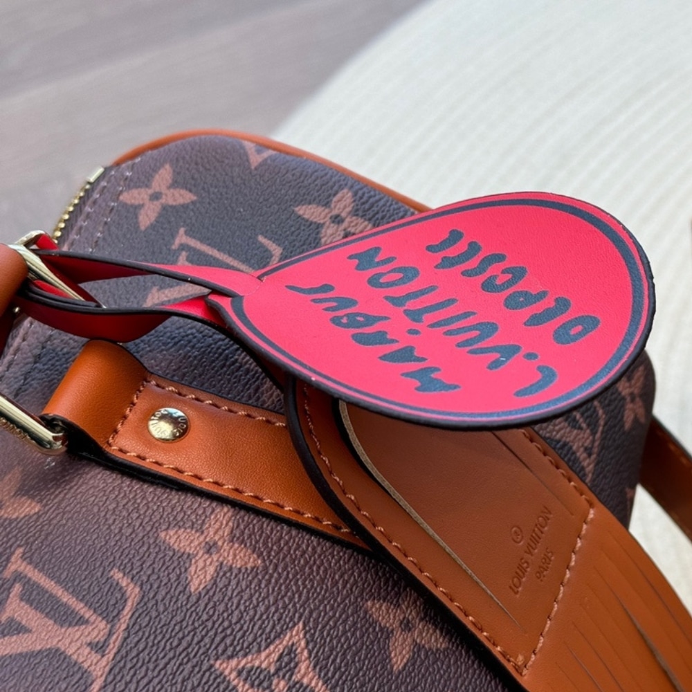 The Keepall Bandoulière 25 takes on a western feel in Pharrell Williams’ new Monogram Dust canvas, with its faded treatment of the iconic Monogram pattern. The two top handles, removable shoulder strap. This small city bag can fit a phone, wallet, and other smaller items.