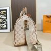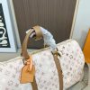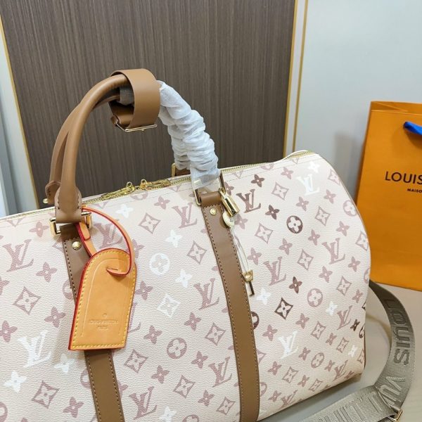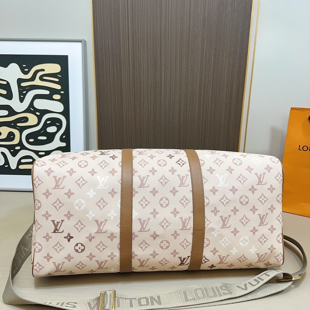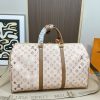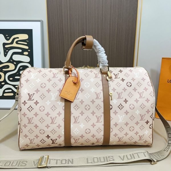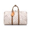 The Louis Vuitton Keepall Bandoulière 50 in Monogram Beige is a travel icon reimagined in a soft, neutral palette for a sophisticated and airy aesthetic. Crafted from durable Monogram coated canvas, it features the legendary motif in a subtle beige-and-tan colorway complemented by smooth leather trim and rolled top handles. This cabin-friendly bag offers a spacious interior secured by a double-zip closure, and includes a removable leather luggage tag along with a detachable, adjustable textile shoulder strap. It perfectly balances heritage style with modern practicality for short trips or stylish daily use.