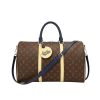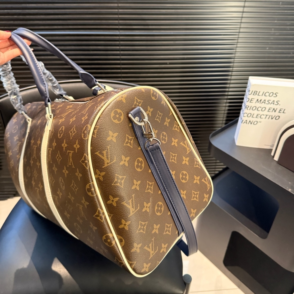 The Louis Vuitton Keepall Bandoulière 50 in Monogram canvas features striking light yellow leather trim and navy blue handles, offering a contemporary and vibrant twist to the house’s legendary travel bag, making it the perfect companion for short trips and weekend getaways.