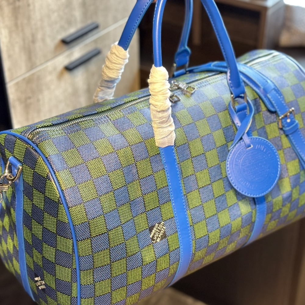 The Keepall Bandoulière 50 looks stunning in Pharrell Williams’ Damier Heritage coated canvas, in a blue-and-green colorway, with the checkerboard punctuated by the classic “Marque Louis Vuitton Déposée” inscription. The blue cowhide-leather trim, top handles, and removable shoulder strap structure the bag, while the Monogram canvas lining inside evokes the House’s heritage.