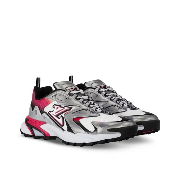 The LV Runner Tatic sneaker is an avant-garde interpretation of a running shoe. It is made from a mix of technical materials, including mesh and metallic varnish, creating a distinctive gradient silver effect. The sporty design of this model is accentuated by the dynamic LV Initials on the side, one of many signature details.