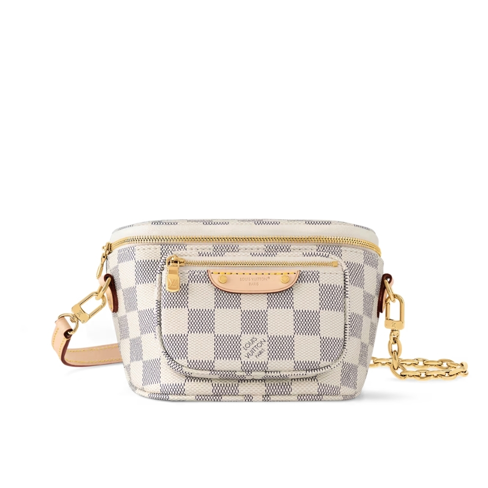 The Louis Vuitton Mini Bumbag in fresh Damier Azur canvas is a chic, feminine interpretation of the classic streetwear staple. This ultra-compact bag features a versatile design with a removable gold-color chain and an adjustable leather strap, allowing it to be worn around the waist, over the shoulder, or as a crossbody. The signature blue and white checkerboard pattern, accented with natural leather trim, makes it the perfect accessory for a light and breezy summer look.