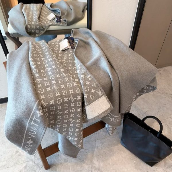 The Louis Vuitton Monogram Cape in grey and white is a sophisticated layering piece that features the House’s iconic Monogram motif in a subtle, contrasting weave. Crafted from a blend that typically includes wool and cashmere, this cape offers a soft, luxurious feel and exceptional warmth for colder seasons. The design is characterized by its elegant, oversized silhouette and draped open front, making it a versatile addition to both casual and formal ensembles. Its jacquard-woven pattern is visible on both sides, and it is finished with a refined Louis Vuitton signature along the hem for a signature touch of luxury.