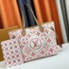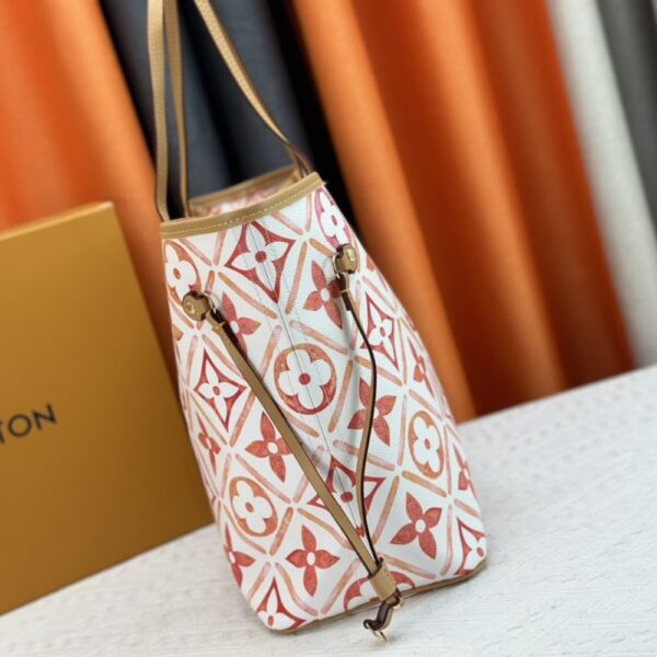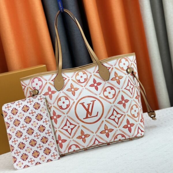 The Neverfull MM tote is made from Monogram Tiles canvas with leather trim along the top of the bag and on the handles. The Monogram pattern has a watercolor aspect and features the LV Circle in the center. It comes with a zipped pouch, with a complementary print, that can be removed and used separately.