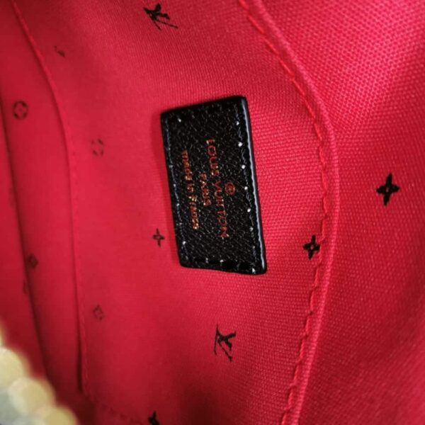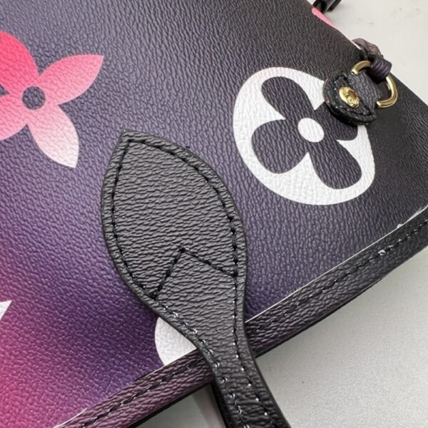 This summery Neverfull MM tote bag is made from Monogram Giant canvas in a gradient pastel colorway and is accessorized with a leather flower charm. The bagâs side laces tighten for a sleek silhouette or loosen for a more casual look. Its interior pouch can be removed and carried used as a clutch while its thin handles slip comfortably over the shoulder or arm.