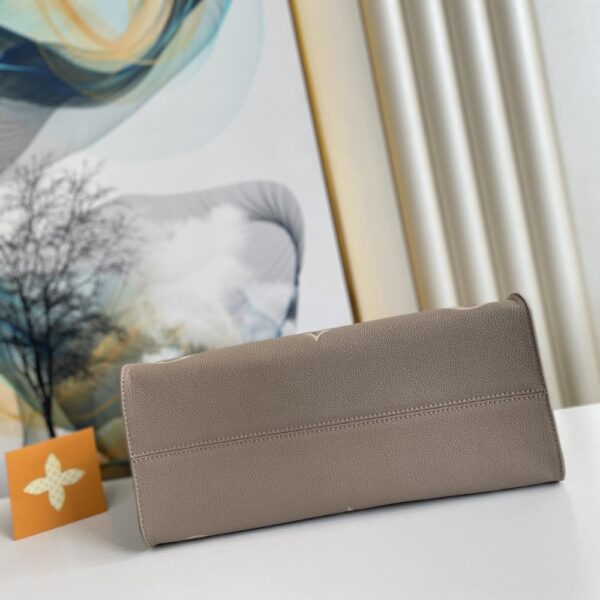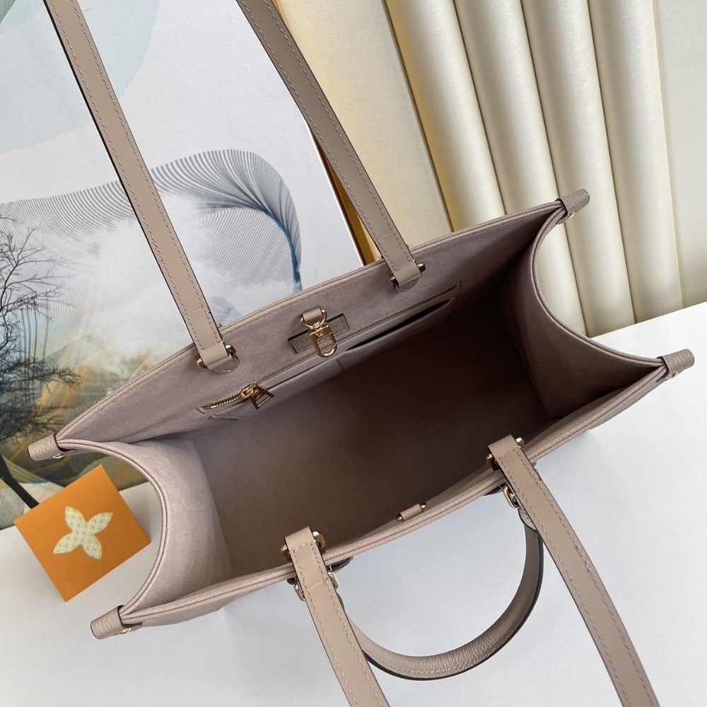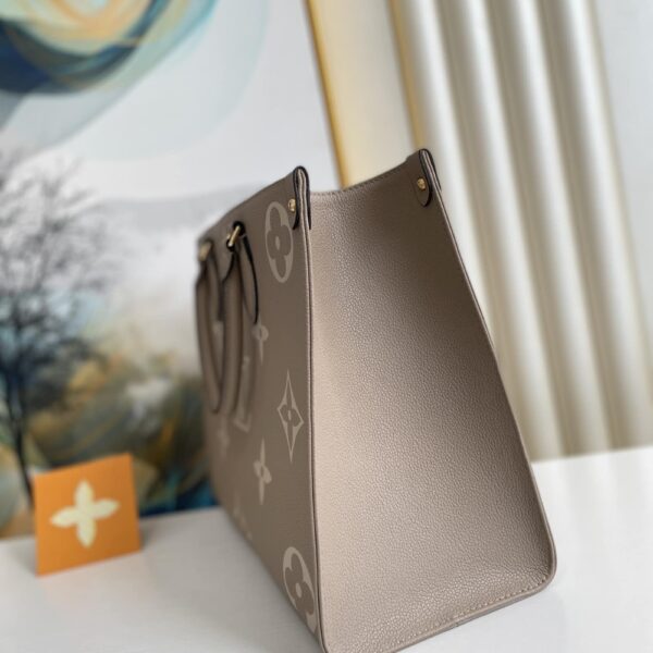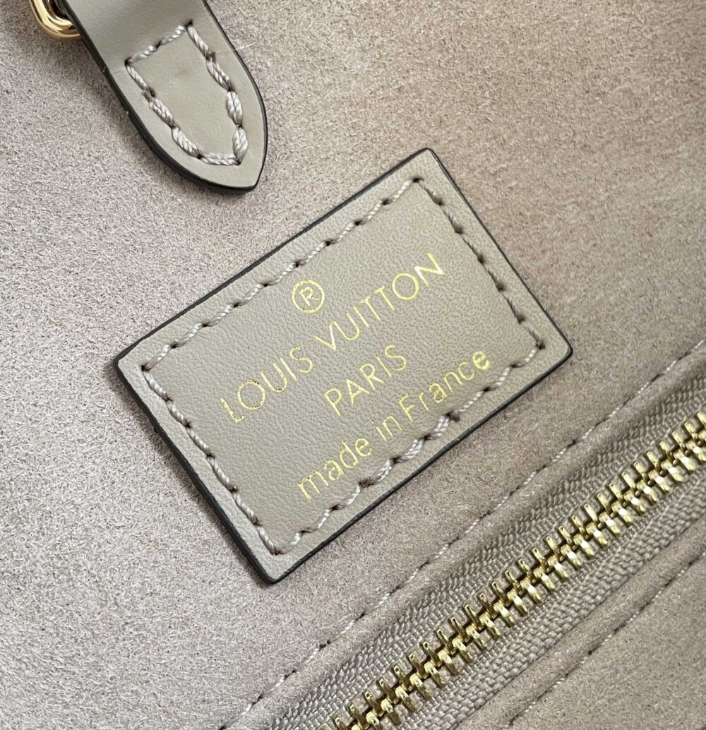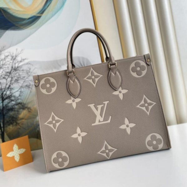 Inspired by Louis Vuittonâs famous Sac Plat from 1968, the OnTheGo MM tote is fashioned in Monogram Empreinte leather, embossed with a Giant Bicolor Monogram pattern. This smaller version of the original Onthego fits essentials such as a mini tablet. Articulated top handles and an adjustable removable strap offer a variety of carry options.