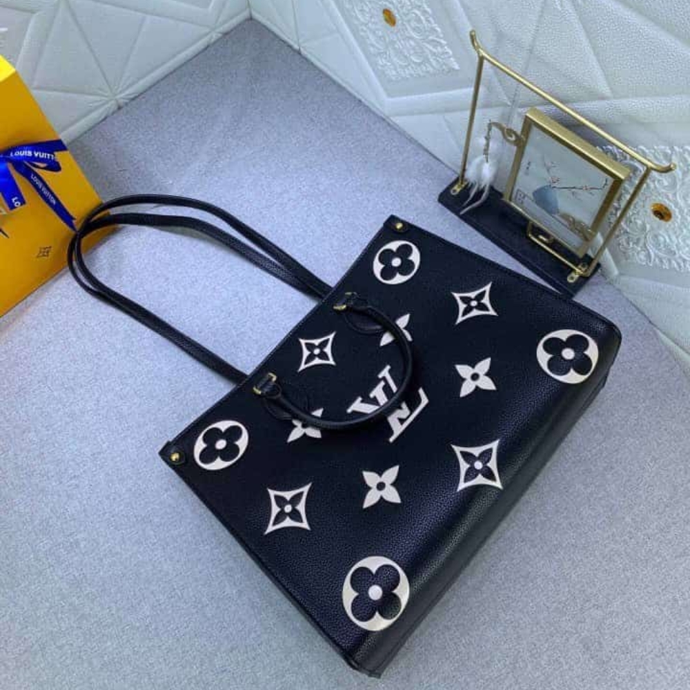 Made from Monogram Empreinte grained leather in a warm two-colour combination, this OnTheGo MM tote bag features the Monogram pattern embossed and printed onto the leather. Its boxy shape means it is roomy and can easily fit a laptop. It has two leather top handles for hand carry as well as two long shoulder straps.