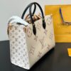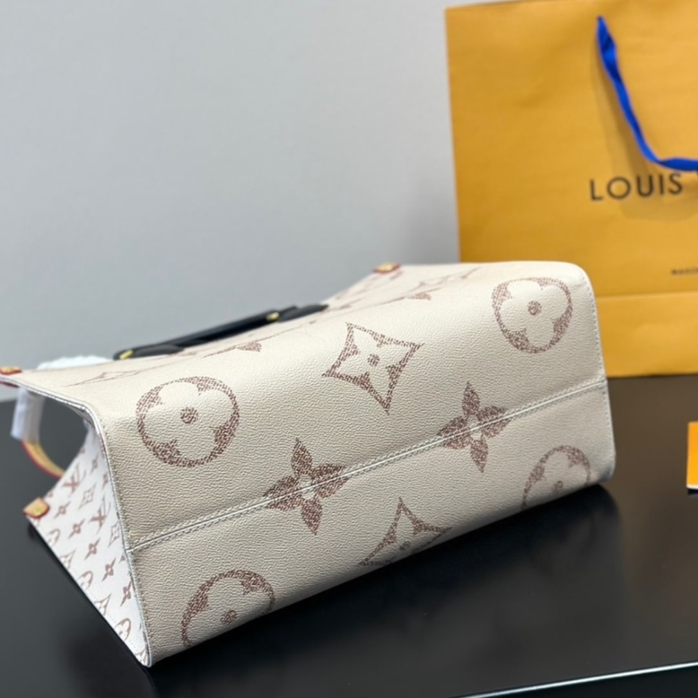 Louis Vuitton OnTheGo MM Tote Bag, specifically the Monogram Dune version from the Cruise 2024 collection. It features oversized Louis Vuitton monogram embossed on white leather with beige diamond stitching, inspired by sand colors. The bag includes black rolled leather top handles, long vachetta strap handles, and gold-tone hardware.