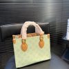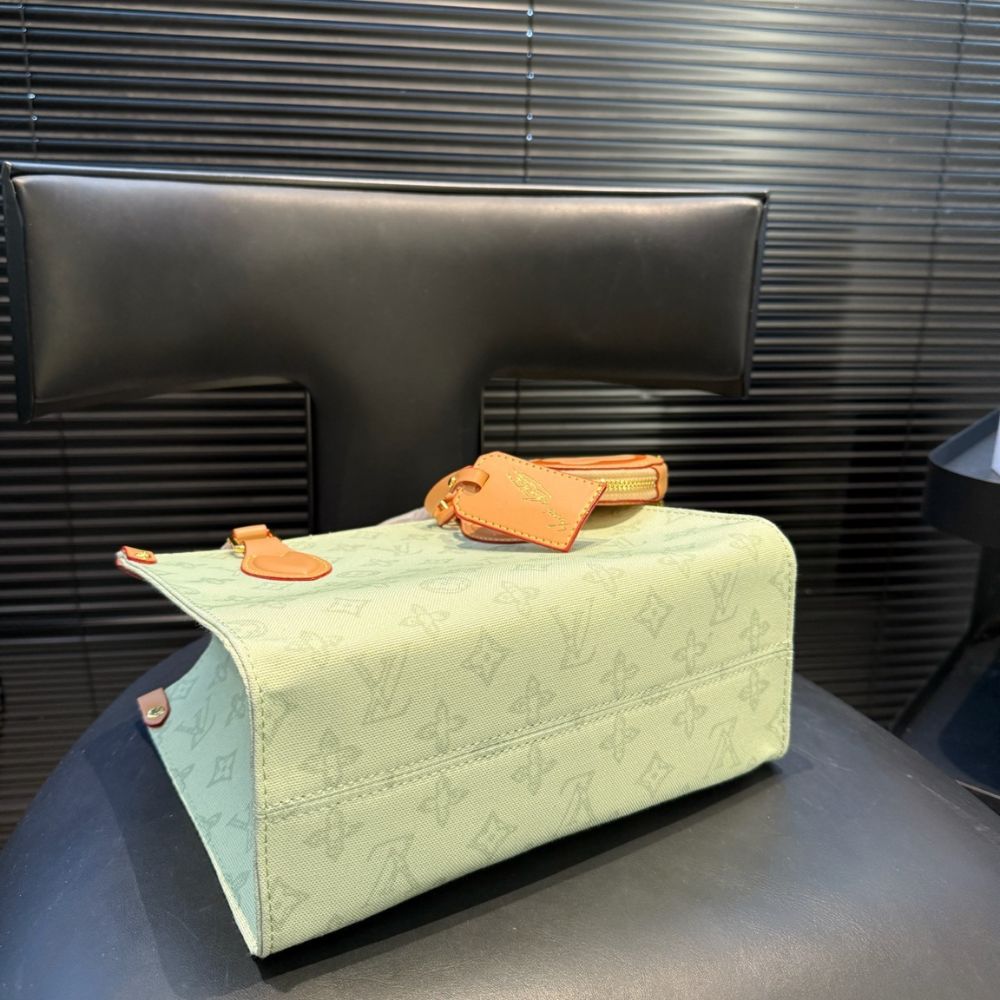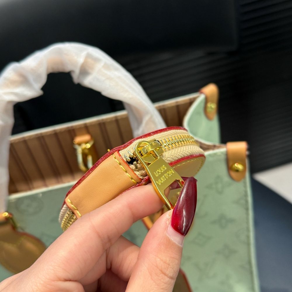 To celebrate the 130th anniversary of the Louis Vuitton Monogram pattern, this OnTheGo PM bag is reimagined in a stylish Monogram Origine Vert Asnières hue. Crafted from Monogram Origine canvas, inspired by the original design and exuding a vintage charm, the bag is accented with a leather shoulder strap, handles, and the iconic luggage tag. The interior features a striped lining and two pockets, one of which is zipped, for convenient storage of small valuables.