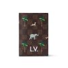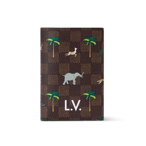 As part of The Darjeeling Limited collection, the Passport Cover is crafted from Damier Heritage coated canvas, animated with a giraffe and elephant racing through palm trees. Signed with L.V. initials drawn from the Louis Vuitton luggage featured in the film, it opens to reveal four card slots, two open pockets, and a flat pocket.