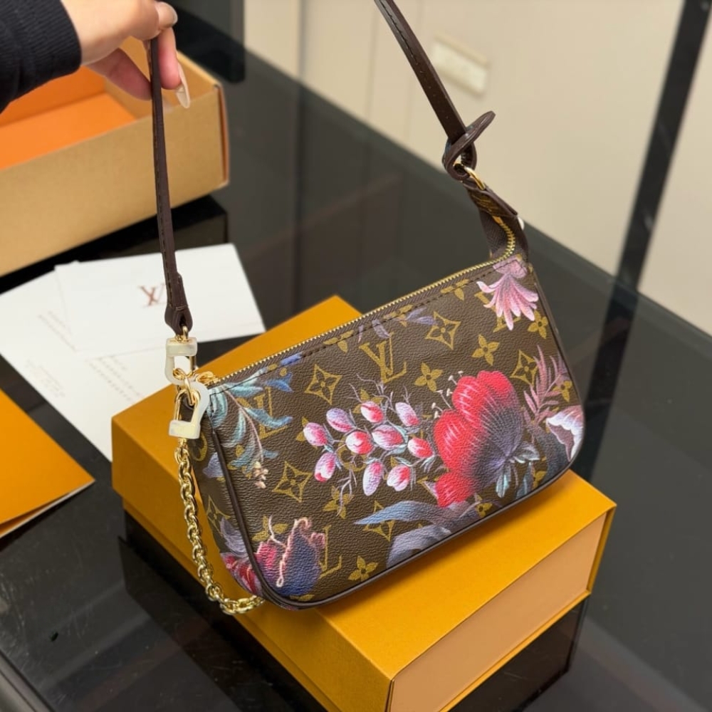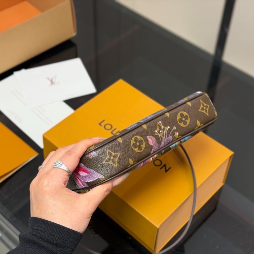 This Monogram Eden edition of the Pochette Accessories strikes the balance of glamour and sophistication with its unique floral motifs. The compact design is crafted from signature Monogram canvas, trimmed with smooth leather and finished with sleek gold-toned hardware. It opens to reveal a large compartment to store everyday essentials, and includes a flat pocket to keep a few cards or notes organized.