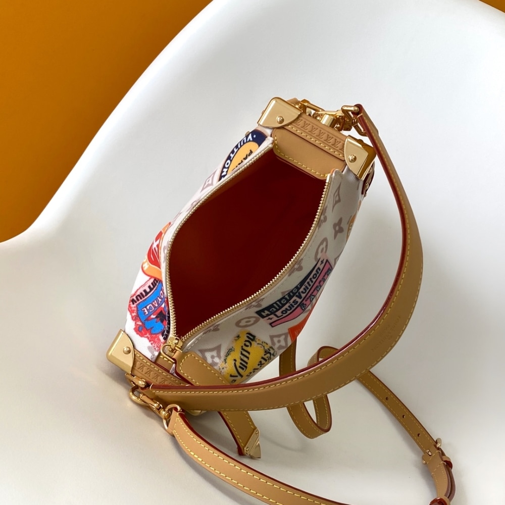 Part of the Flight Mode collection, this Side Trunk MM is offered in Monogram Dune canvas, reimagined with a vintage-inspired finish. The lightweight design is decorated with playful labels in a patchwork effect and is elevated with gold-toned hardware. The iconic natural leather trimmings pay tribute to the House’s trunk-making heritage.