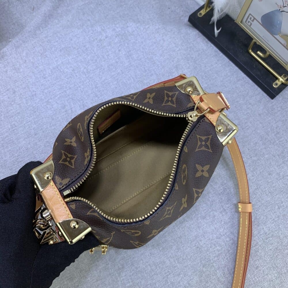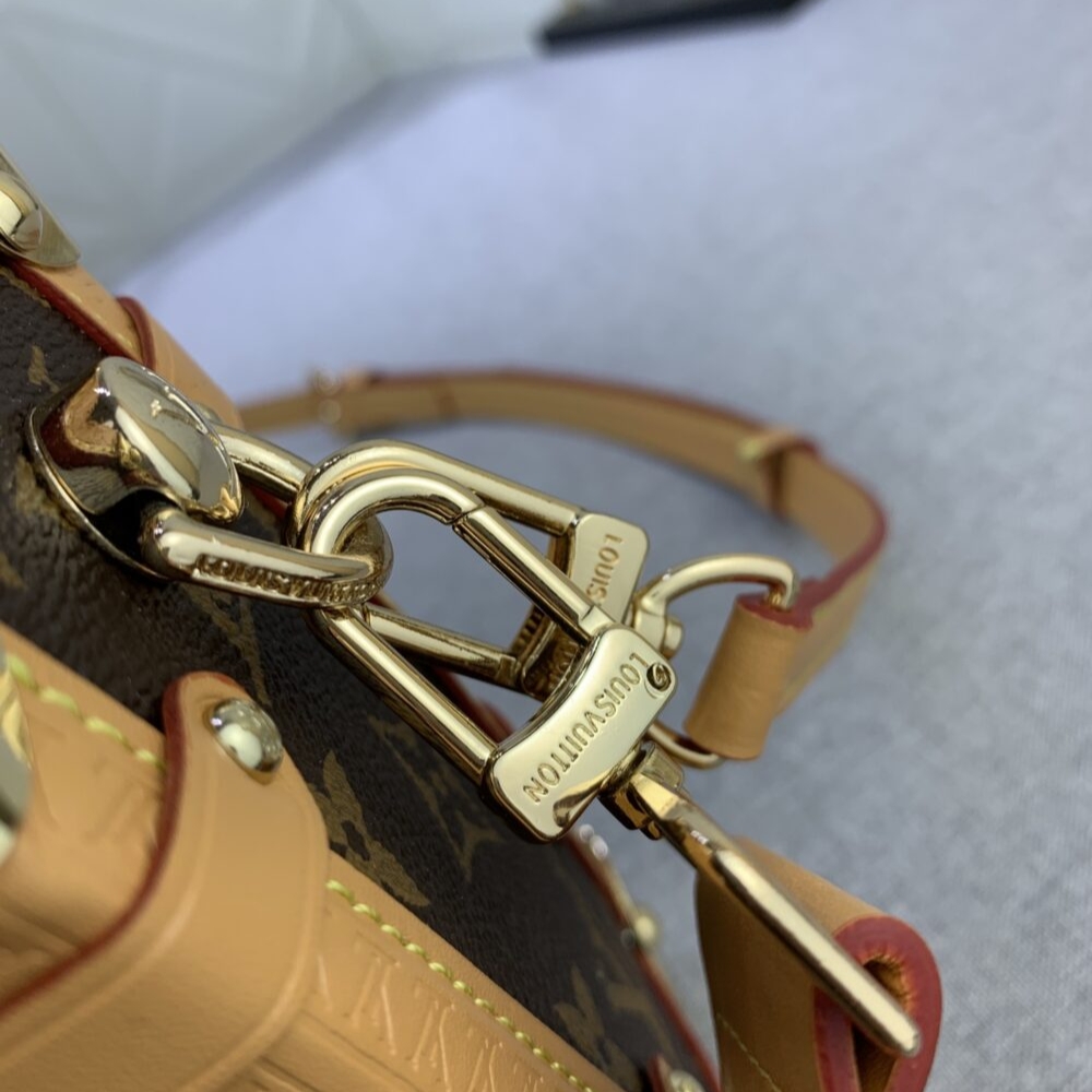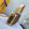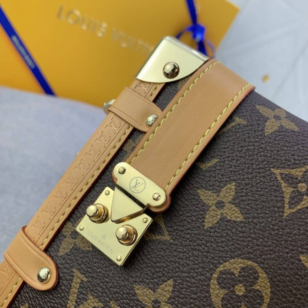 The rectangular PM Side Trunk is crafted from Monogram Canvas, gold-tone metal details. The reinforced corners and S-lock closure are inspired by classic Louis Vuitton trunks. The bag can be carried as a handbag or on the shoulder thanks to the removable and adjustable leather strap.