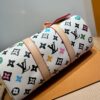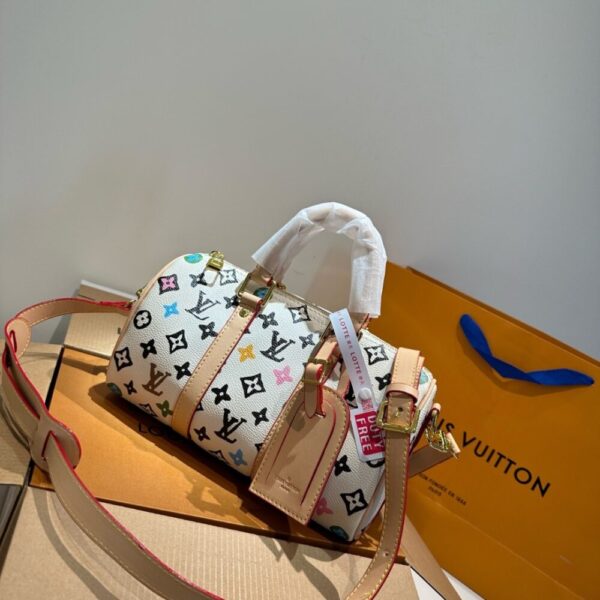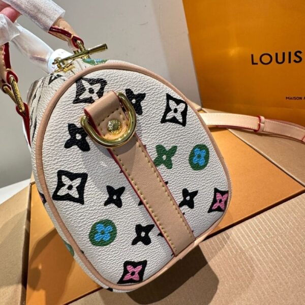 Louis Vuitton x Takashi Murakami Speedy Bandoulière 25 bag, featuring a multicolored monogram print on a white coated canvas. This limited-edition bag is a collaboration between Louis Vuitton and Japanese artist Takashi Murakami. The design incorporates Murakami’s signature pop-colored palette and may include playful elements like a cherry blossom motif or a bow-shaped key bell.
