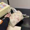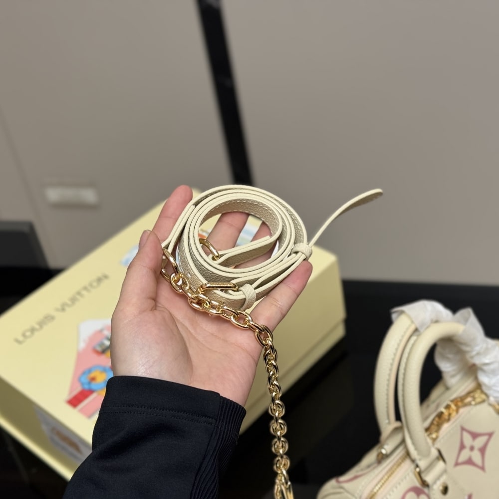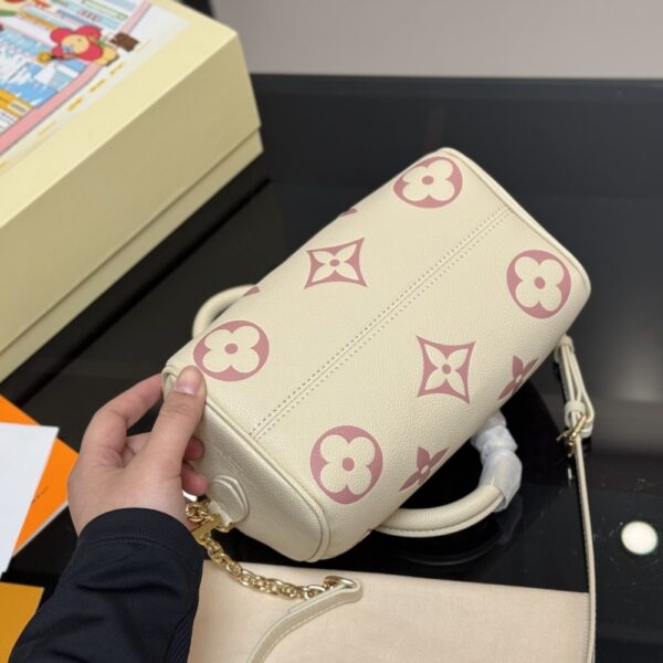 Louis Vuitton Speedy Bandoulière 20 handbag. This specific model is crafted from Monogram Empreinte leather, featuring the iconic Monogram pattern embossed and printed in a bicolor design, such as cream and rose. The bag’s design is inspired by Louis Vuitton’s historic Speedy travel bags, evoking a sense of timeless elegance.