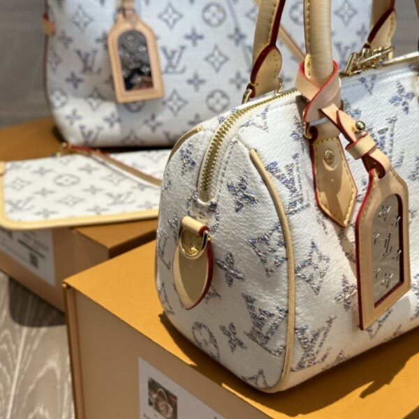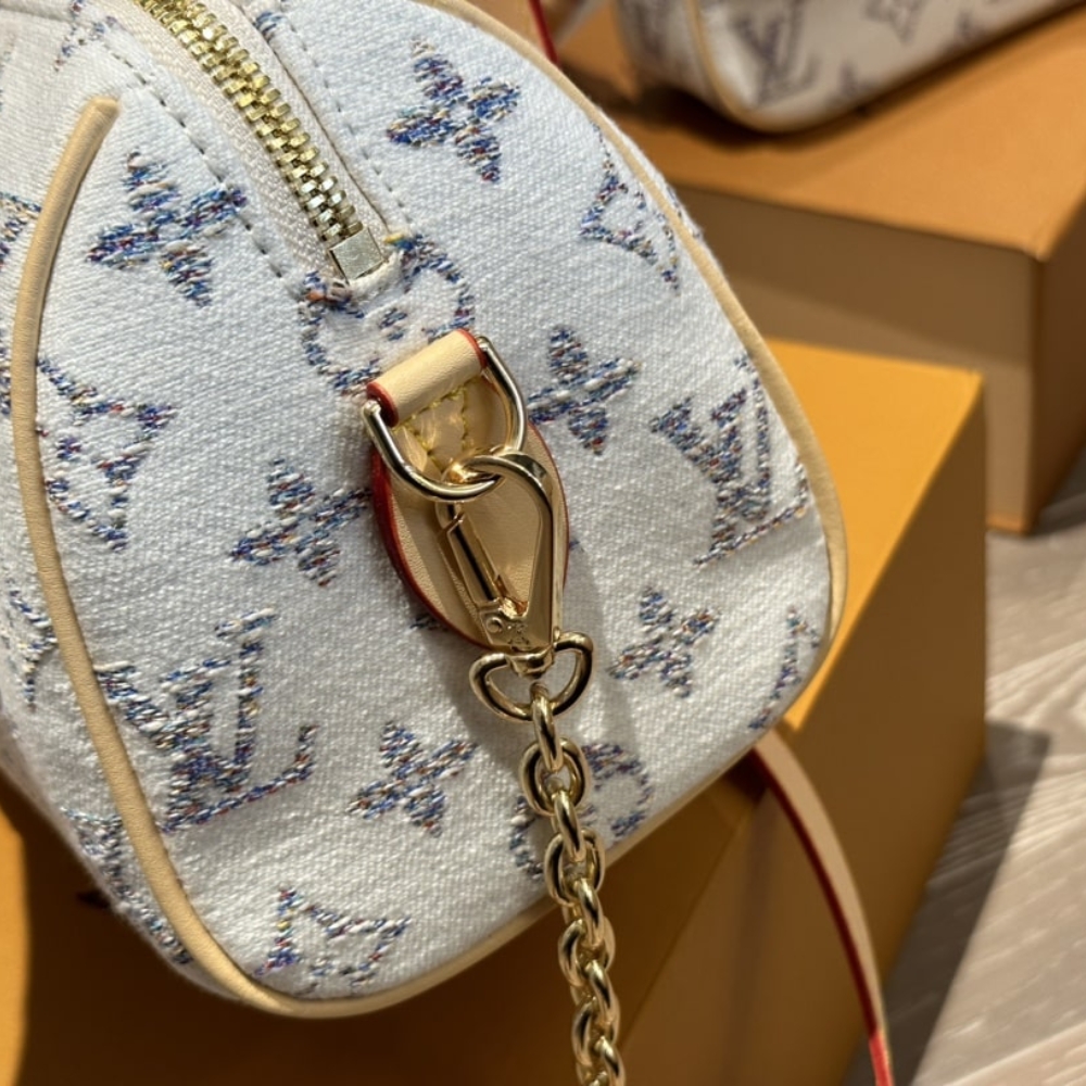 The Speedy 20 Bandoulière handbag is made from Monogram Empreinte leather in a soft pastel colorway. The bag’s unique shape is inspired by the House’s Speedy travel bag from the 1930s. A removable and adjustable chain-strap enables shoulder wear while the two top handles allow hand carry.