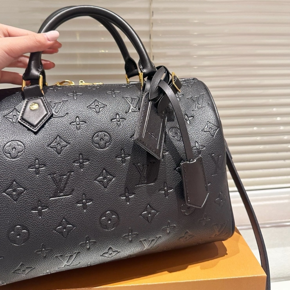 The new version of the Speedy Soft 30 bag reinterprets the Maisonâs classic in a classic style. Ideal for travel enthusiasts, the design features an airplane decoration and eye-catching brand label print inspired by Gaston Louis Vuittonâs original collection. It can be worn on the shoulder thanks to the long, easily detachable strap.