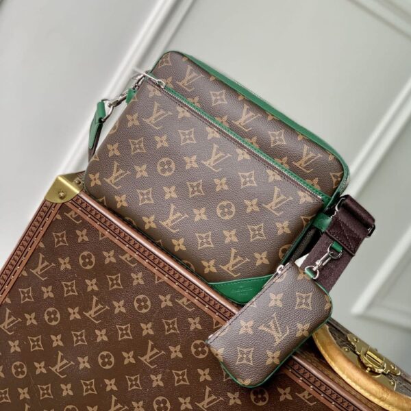 The Trio Messenger Bag is crafted from Monogram Macassar Canvas and accented with colored trim. This versatile design features a main compartment, a removable zippered pocket, and a coin purse that attaches to the D-ring on the strap.