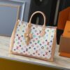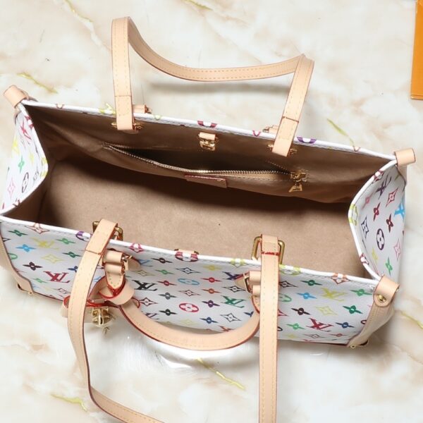 The LV x TM On-the-Go Trunk MM is an exclusive, limited-edition version of this iconic bag. Crafted from the Louis Vuitton x Takashi Murakami collection’s Monogram Multicolore canvas and trimmed with the Maison’s signature tanned leather, this vibrant statement piece. The elegant gold-tone corners mimic the details of the Maison’s traditional trunks. The LV x TM key bell adds a touch of elegance to this collaboration’s unique design. The shoulder strap and two top handles allow for versatile carrying.