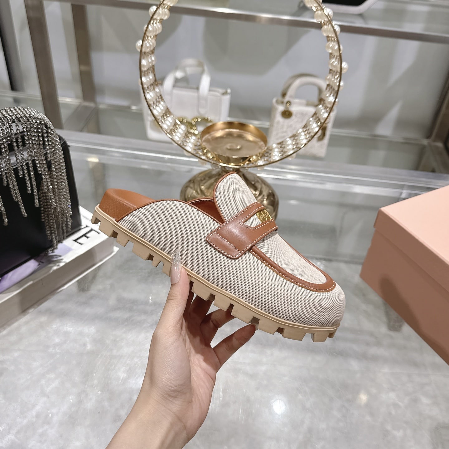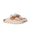 • Upper with leather strap and logo-engraved metal coin