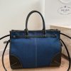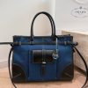 The Prada Bonnie Denim Handbag combines denim and soft brown leather, offering a style that’s both vintage and modern. It features signature prominent stitching and a buckle detail, adding to its sophisticated charm.