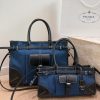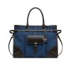This pragmatic and refined handbag is made of denim leather with a finish that emphasizes its versatile, modern allure. The geometric design blends different influences into one style with a distinctive but sleek aesthetic. Embellished by the sophisticated strap detail, the rectangular silhouette has a roomy interior with zipper pockets.