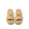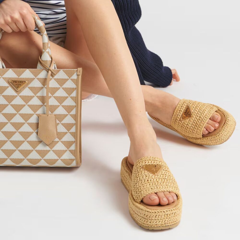 A simple yet sophisticated crochet pattern enhances the design of these flatform sandals decorated with Prada’s metal triangle logo that gives the sandal an iconic note.