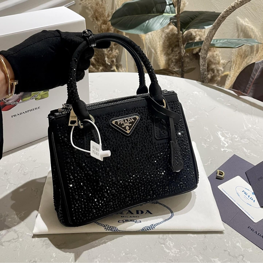 The Prada Galleria Satin Mini Bag with Crystals in black radiates pure glamour, transforming an icon of timeless design into a dazzling statement piece. Its refined silhouette, adorned with sparkling brilliance, embodies modern luxury that elevates every look with irresistible prestige.