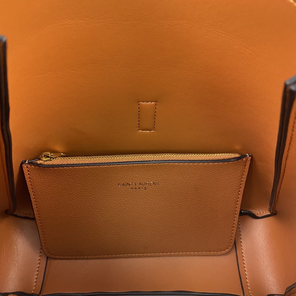Grained leather and open top with foldover leather strap with gold-tone cassandre hardware. Single main compartment. One interior slip and zipper pockets.