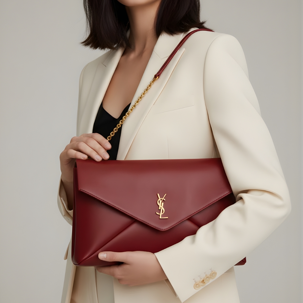 Extra-large chain pouch decorated with the CASSANDRE. A stowable cable-chain strap allows this modern and versatile bag to be worn on the shoulder or held as a clutch.