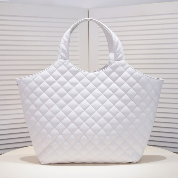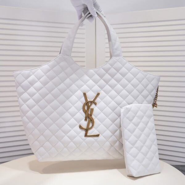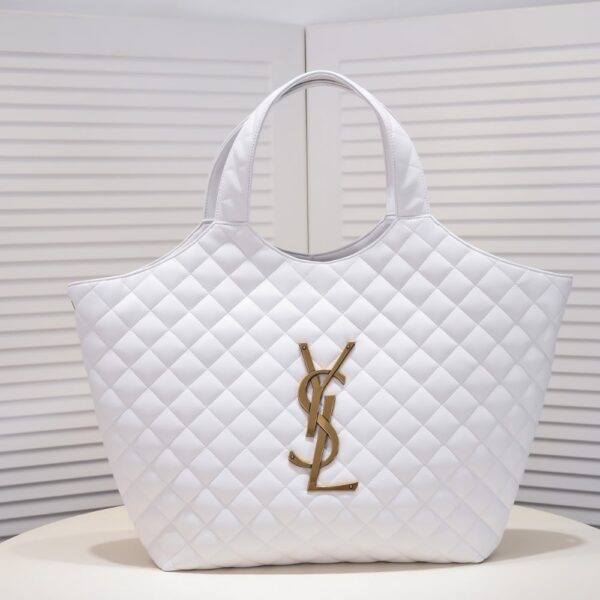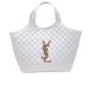 Crafted from white leather, the Saint Laurent Maxi Icare tote is defined by its oversized silhouette and diamond quilting. Featuring the iconic YSL monogram, this spacious carryall merges practicality with polished Parisian allureâan effortless companion for everyday luxury.