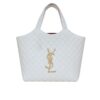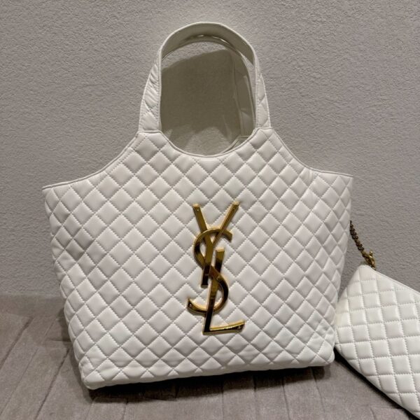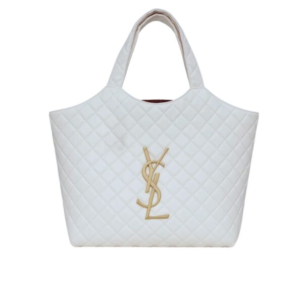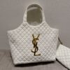 Saint Laurent Icare Shopping Bag In Quilted White – featuring a diamond-quilted design with oversized YSL bronze-tone hardware. The spacious silhouette combines elegance with practicality, perfect for everyday or travel. Comes with a matching pouch for added convenience