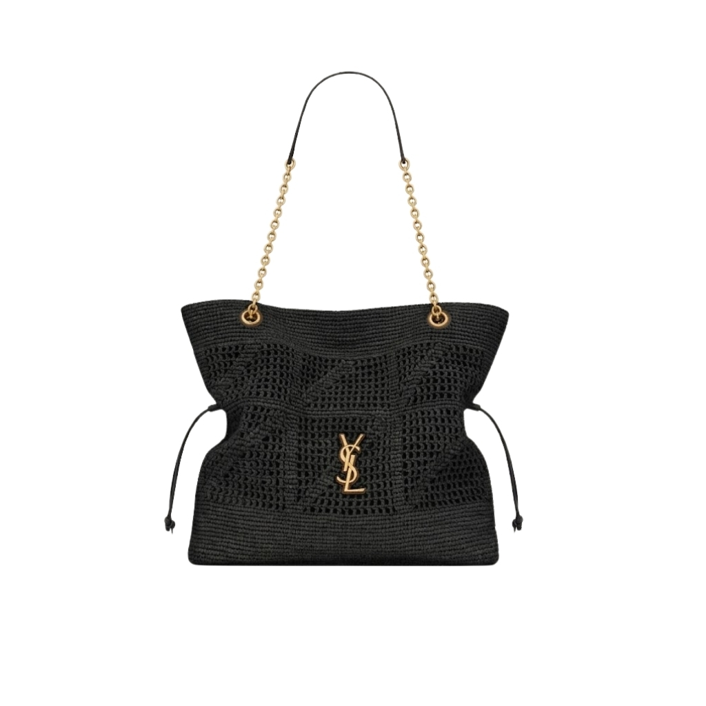 The tote version of the JAMIE in raffia, decorated with the CASSANDRE and CARRÉ RIVE GAUCHE weaving. This lightweight and spacious bag features a chain strap. Drawstring ties allow the sides to be cinched or expanded to create different silhouettes.