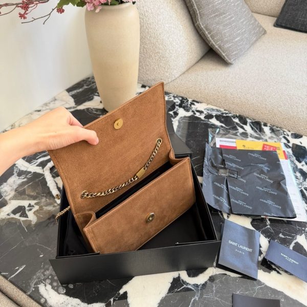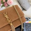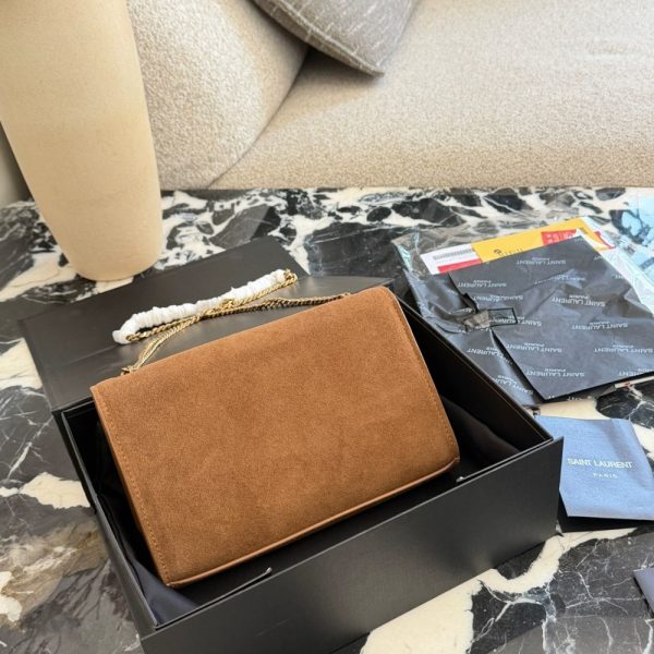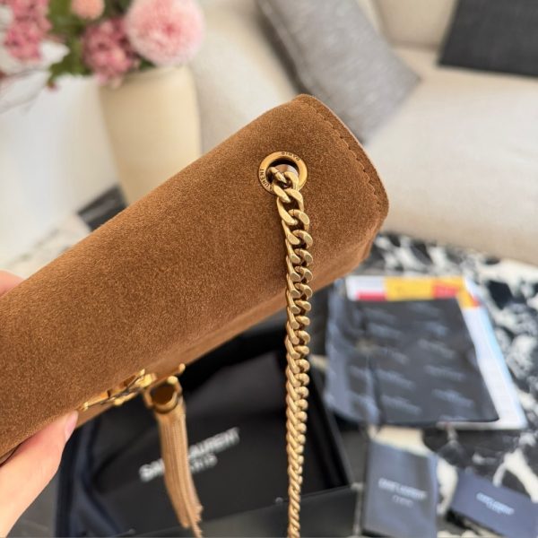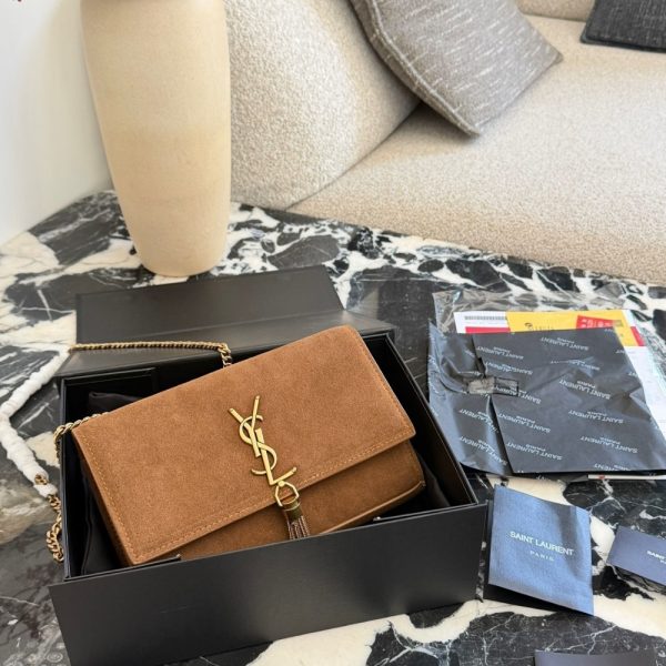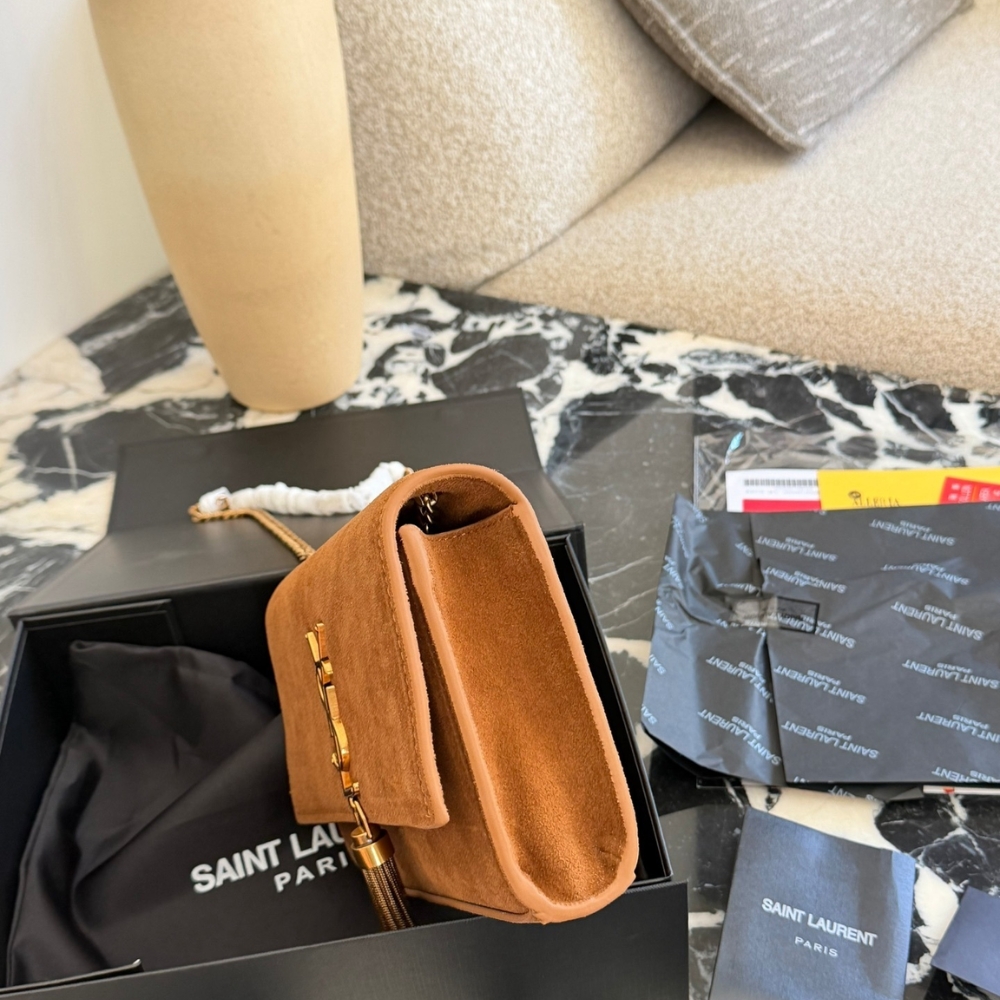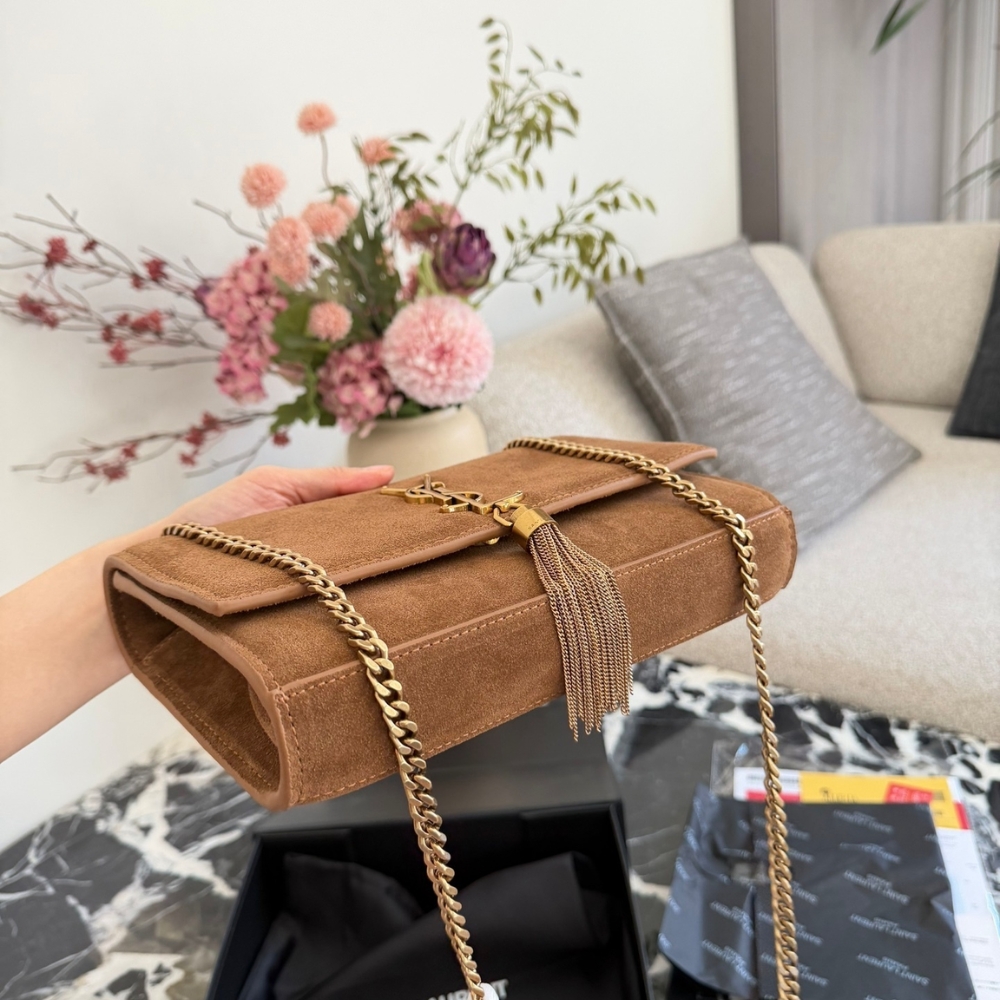 The Saint Laurent Kate Medium Tassel in Brown Suede is a shoulder bag that embodies Parisian elegance with its rich suede construction and iconic gold-tone hardware. It features a prominent YSL monogram plaque with a hanging metal chain tassel on the front flap, which secures easily with a magnetic snap closure. The bag is designed with a versatile long chain strap, allowing it to be worn as a crossbody or doubled for a shorter shoulder drop, and it can even double as a clutch.