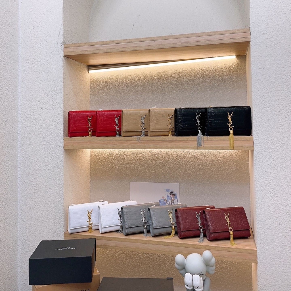 Presented in red, it features the label’s signature YSL logo to the front as well as a magnetic fastening, hanging tassel, a gold-tone chain shoulder strap and a single internal slip pocket and logo plaque. Invest in your own piece of Saint Laurent style by pairing yours over slim fit winter coats or patterned long length slip dresses.