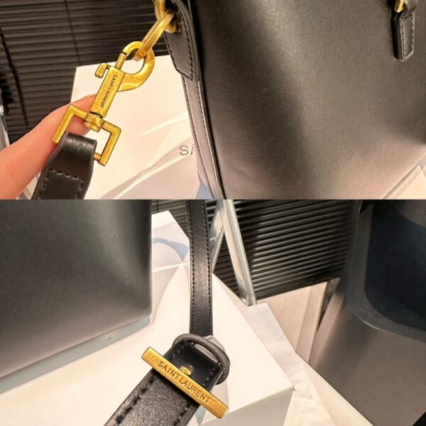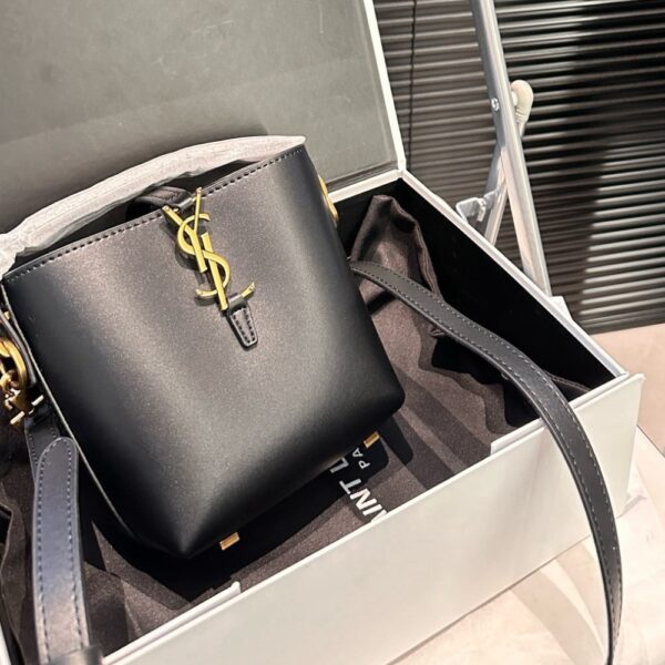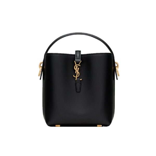 The Saint Laurent Le 37 Mini Bag is crafted in black leather, showcasing a structured silhouette with the signature bronze-tone YSL monogram. Compact at 15cm, it features a sleek top handle and adjustable strap for versatile wear. A timeless statement piece that blends elegance with modern edge.