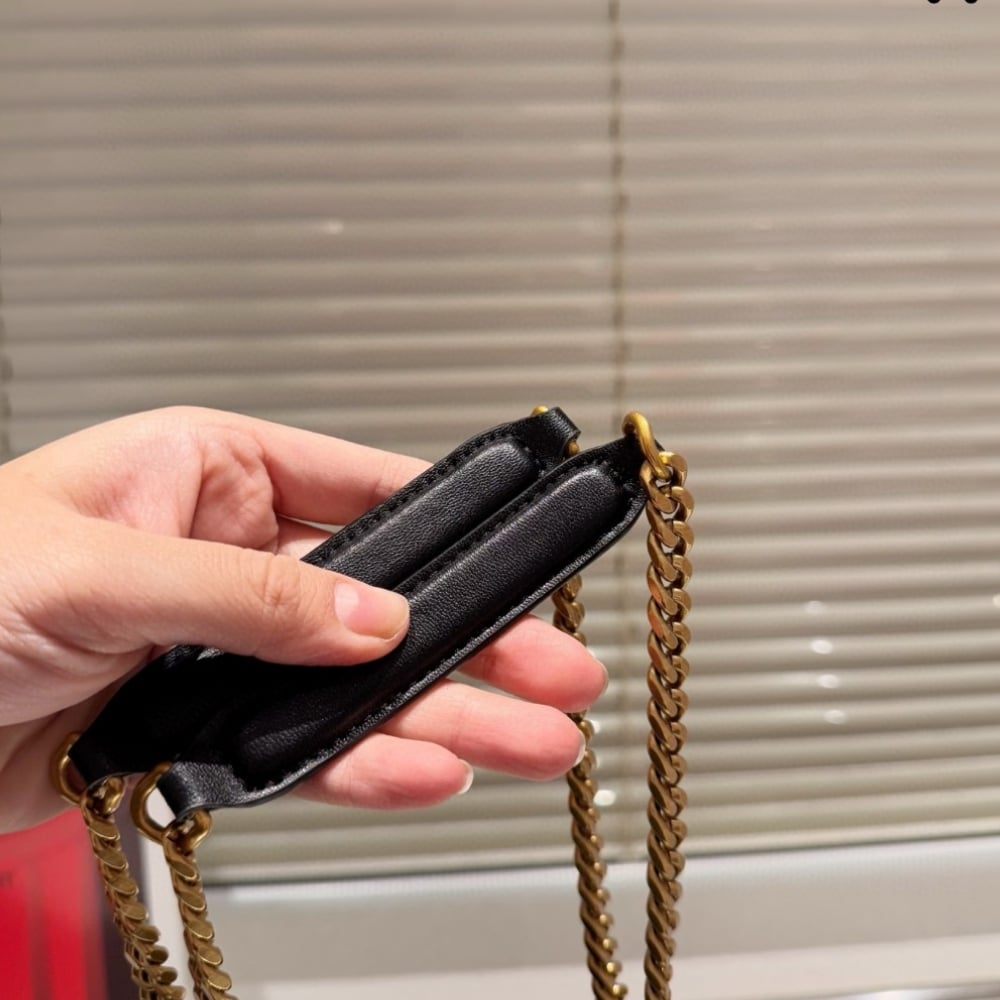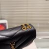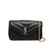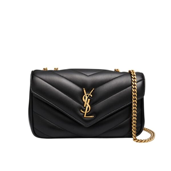 This is a Saint Laurent Loulou bag in black quilted leather. It features a chevron pattern with the signature gold YSL monogram on the flap. The bag is completed with a gold-tone chain strap for a chic and versatile look.