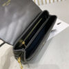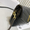 This is a Saint Laurent crossbody bag in black quilted leather. It features the signature YSL logo in bronze-tone hardware on the flap. The slim adjustable strap adds versatility, making it suitable for everyday wear.