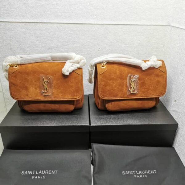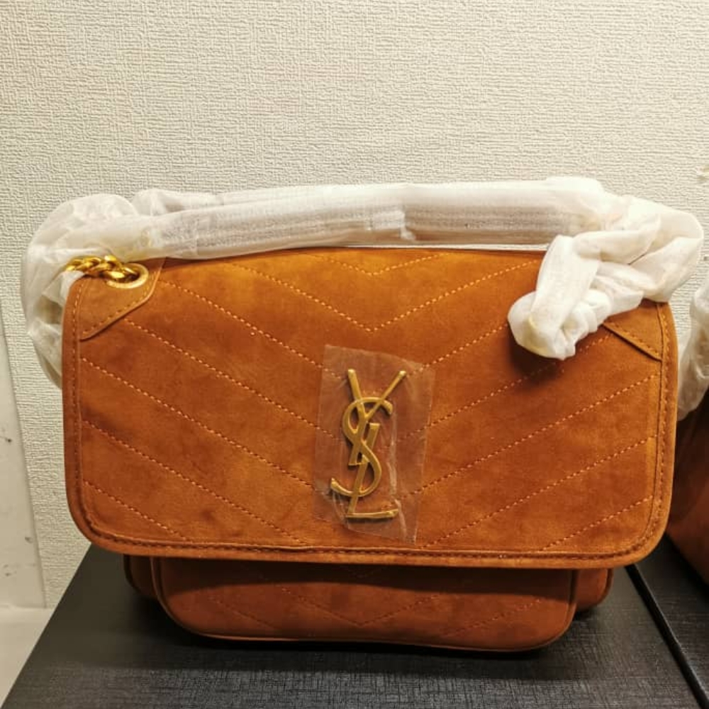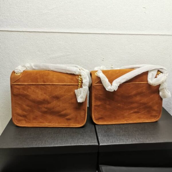 The Bag Saint Laurent Niki Brown shade chevron quilted suede leather Niki crossbody bag. 2020 collection. Camel leather YSL Cassandra jewel and trim. Antique gold-tone brass jewelry. Chain and leather slider strap. Magnetic clasp on the flap. Back slit pocket. Front box compartment. Black fabric and leather interior. One inner zipped pocket and one patched pocket.