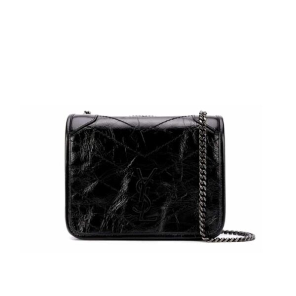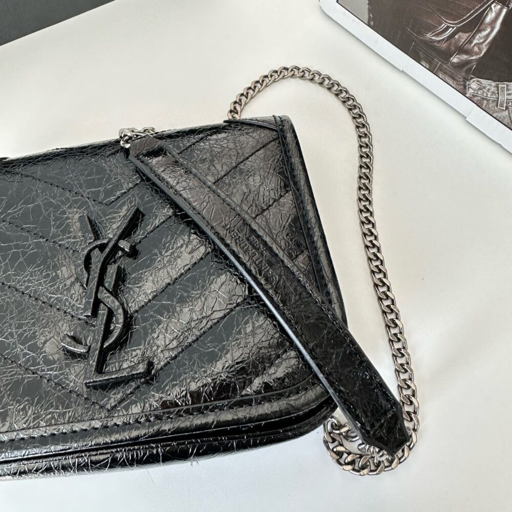 The Bag Saint Laurent Niki Vintage, It features a chevron-quilted design, tonal YSL monogram on the front, and a sliding chain strap with leather shoulder support. Elegant and edgy, it’s perfect for day-to-night wear.